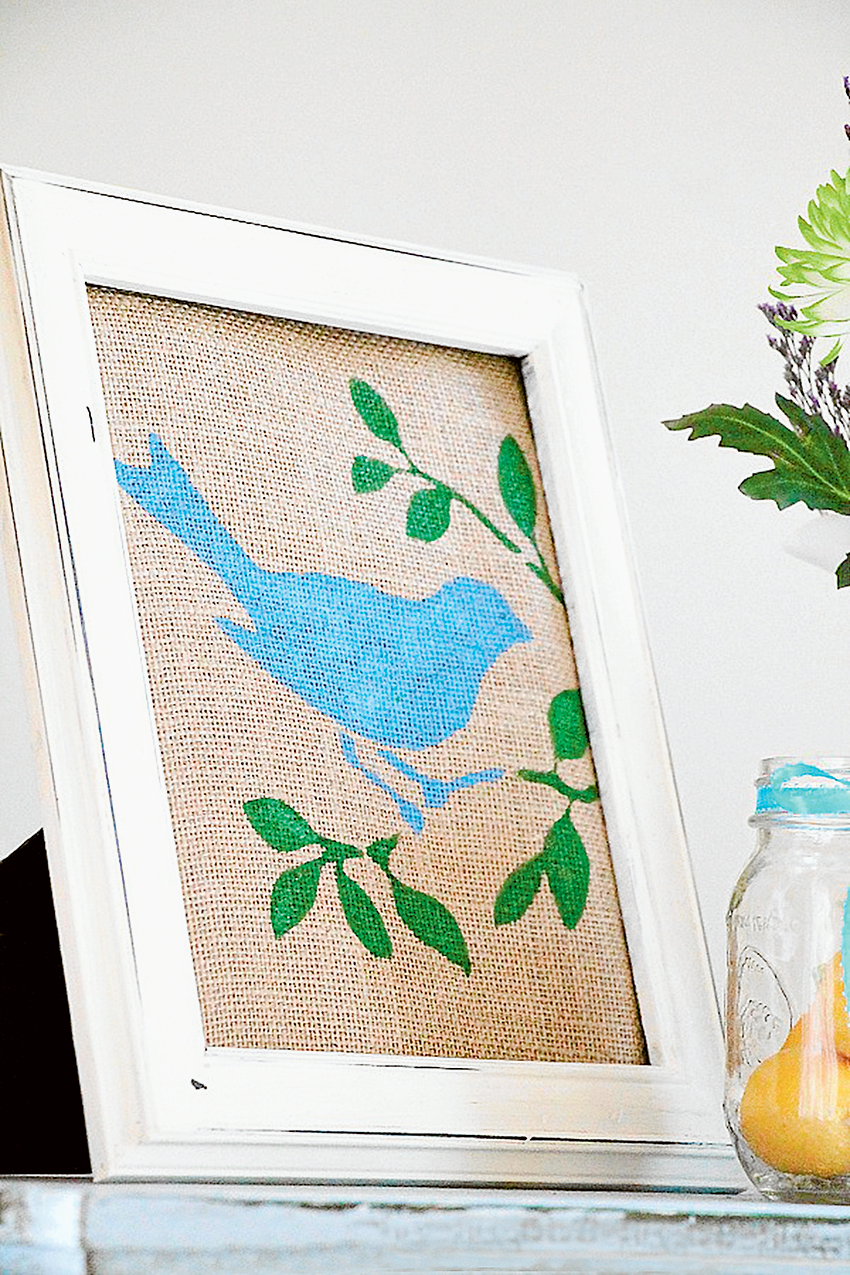 Cut the burlap to fit the size of your frame. Place the stencil over the burlap and using your chosen craft paint colours, paint the stencil on using the sponge brushes.
