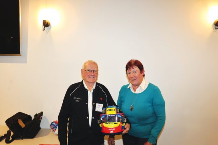 FORMULA ONE… Oscar Piastri’s beloved Grandfather, Hugh Macfadyen, shared an insight into Oscar’s early years and rise to fame as a guest speaker at the Rotary Club of Shepparton. Pictured is Hugh holding one of Oscar’s racing helmets with Rotarian Jenni Hill. Photo: Aaron Cordy