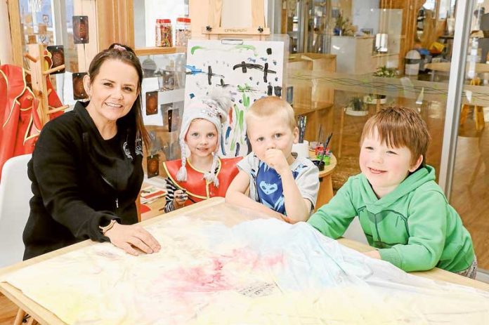 HANDS ON LEARNING… From left, Nido Early School service administrator, Casey Eckel with 4-year-old, Neveah, 5-year-old, Luke and 4-year-old, Lincoln. Photo: Katelyn Morse.