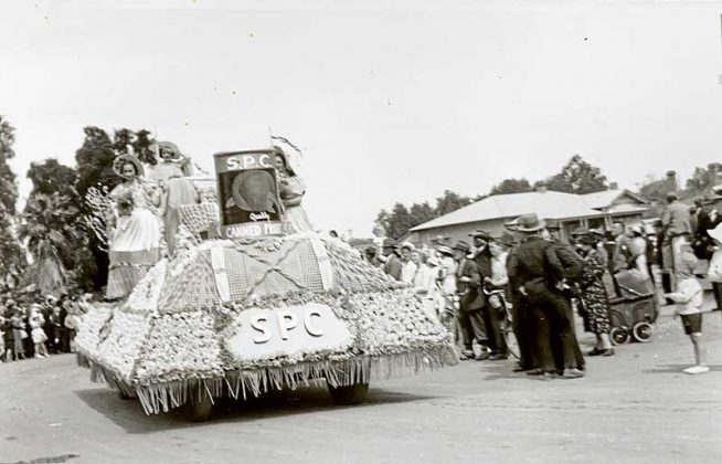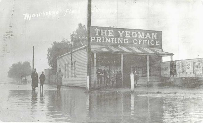 The Yeoman Printing Office on the corner of McLennan and O’Brien Streets in Mooroopna. In 1938 Doonan’s Garage was built here and today it is the location of Verong Vittles Cafe & Takeaway. This shot was taken in June 1917 during the Mooroopna floods, when the Goulburn River gave way and water gushed into the main street.