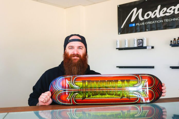 SHOWING UP FOR MENTAL HEALTH… Hussln Auto Detailing owner Cam Scorey holds a fundraiser on the anniversary of opening his business to raise money for Beyond Blue. This years’ event in Tatura is set to be even bigger, with part of Hogan Street closed off for a Show and Shine. There’s heaps of raffle prizes to be won, and trophies like the limited-edition skateboard (pictured). Photo: Deanne Jeffers