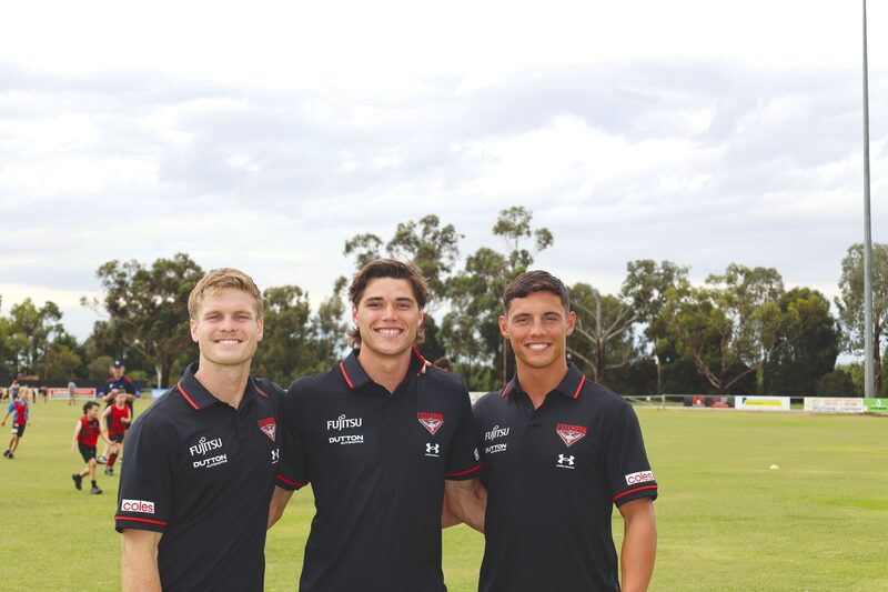 COMMUNITY CAMP… Essendon Bombers came to town visiting schools and held clinics over two days. From left, Harrison Jones, Matt Guelfi and Dyson Heppell entertained students from Orrvale Primary School. Insert from left, Ben Hobbs, Sam Durham and Jye Caldwell at the Auskick clinic Monday afternoon. Photos: Aaron Cordy