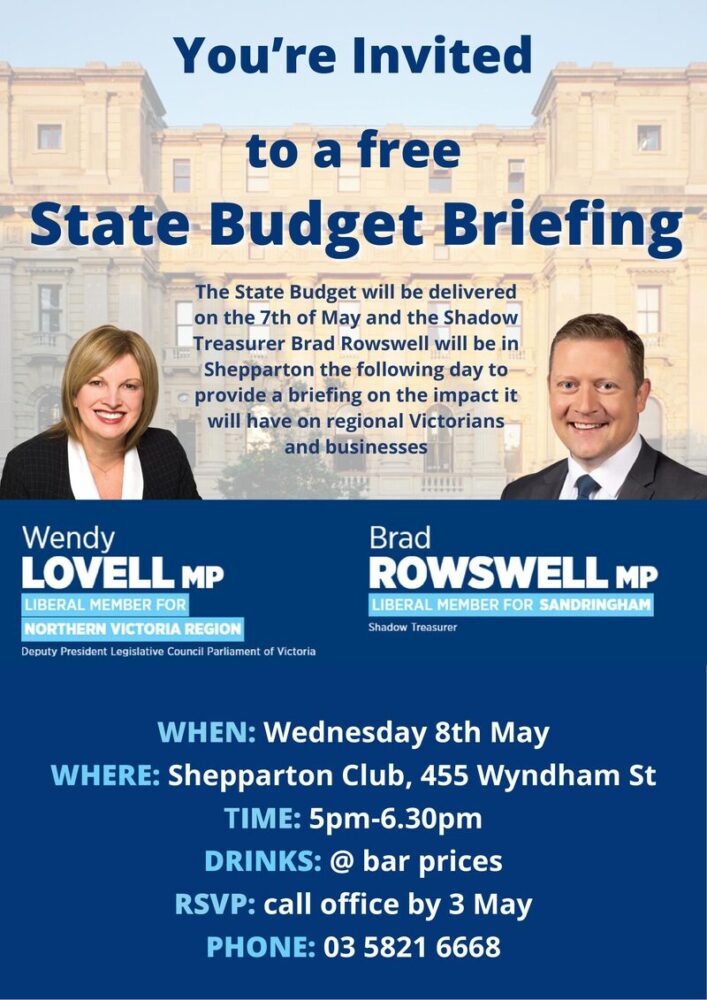 THE State Government will deliver the 2024-25 State Budget on Tuesday, May 7. The Shadow Treasurer Brad Rowswell will be in Shepparton the day following budget night to deliver a briefing on how it will impact regional Victorians and businesses.