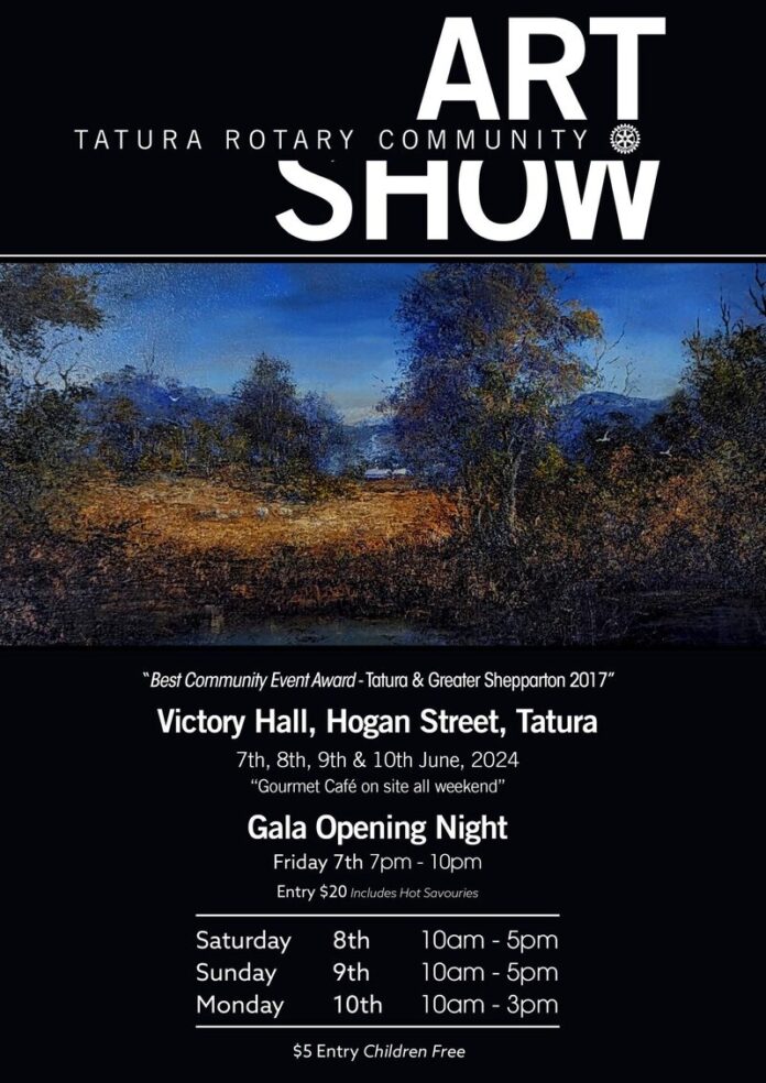 The Tatura Rotary Community Art Show will be held at Victory Hall, Tatura June 7-10, 2024, with the gala opening night scheduled for Friday, June 7, 7-10pm.