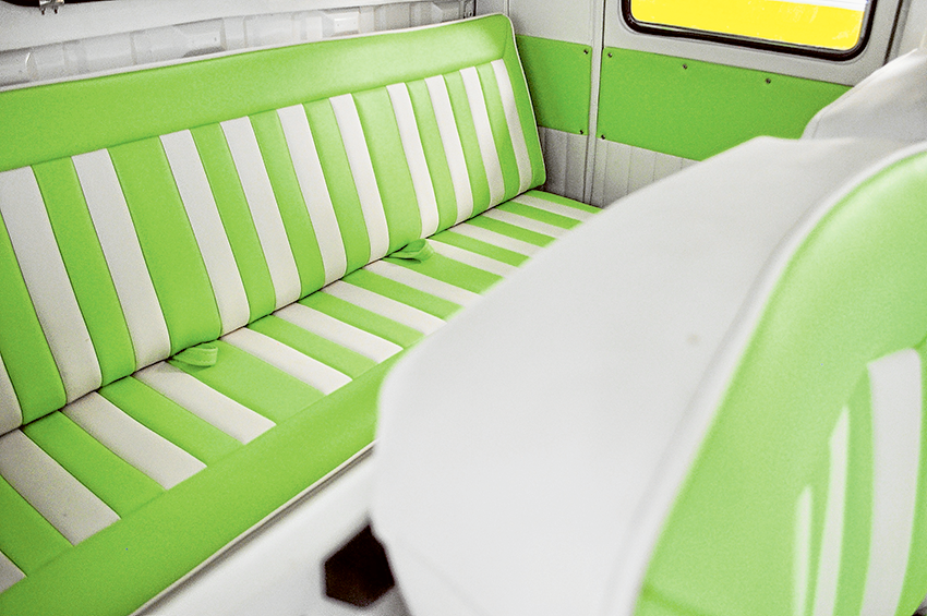 “I’m grateful for the help of my wife, Leah, who assisted with the interior door cards covering. Also a massive thanks to Mick Falla from Falla’s Upholstery to trim the rest of the bus in matching lime and cream vinyl.”