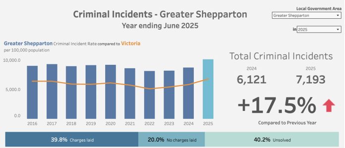 Greater Shepparton has recorded a 17.5 per cent rise in criminal incidents, according to the latest crime statistics. While slightly lower than the more than 20 per cent increase reported earlier this year, the upward trend continues across all offence types, suburbs and locations.