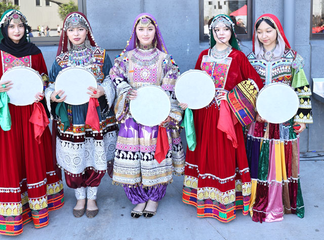 BEAUTIFUL DRESSES… The Afghan students from left, Muhadesa Shefaee, Mahdia Safdari, Nafissa Rezaee, Robina Karimi and Ruqia Rezaei. Photo: Aaron Cordy