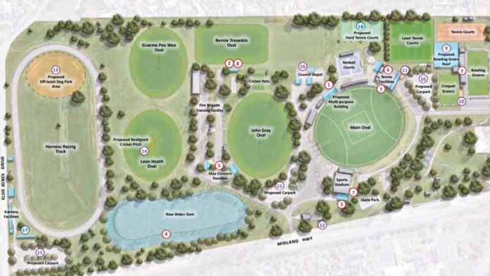 “The space is home to a trotting track, two ovals, grass and hard surface tennis courts, lawn bowls, croquet, netball, a fire brigade training area, playground and a number of toilet and change facilities as well as a functions and event centre.”