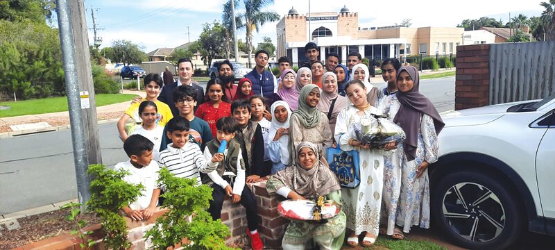 The community of the Moslem Mosque raised money for Sadaqat al-Fitr, a charity donation that went to food for families in need, as well as raising money for gift bags for the neighbours of the Mosque. Pictured are the children of the Mosque with Iman Hysni giving out the gifts. Photo: Supplied