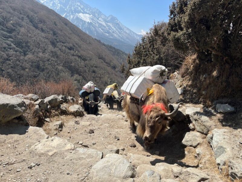 When we went to breakfast there was a gentleman who was on an oxygen bottle, and he was airlifted out by helicopter. Three in our group took a helicopter back to Kathamndu, while the rest of us started the trek down to Pheriche. I felt I had all the air I needed as we headed down. The assistance guide helped me almost run down the 1,000m of altitude. He would hold my wrist if we came to a slippery area where the Yaks had stirred up the dust and sand onto the rocks.