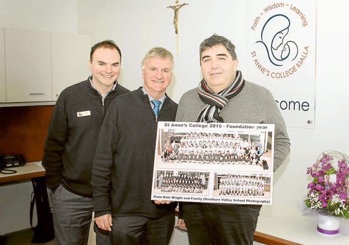From left, Dale and Stuart Wright from GV School photography were honoured to present principal of St Anne’s College, Dom Poppa with the inaugural foundation year portrait. The photo was presented as a thank you to the new college for supporting local business and acknowledging that local businesses are able to compete in the market. Dale and Stuart are excited to watch the growth of St Anne’s College over the forthcoming years. Photo: Supplied.