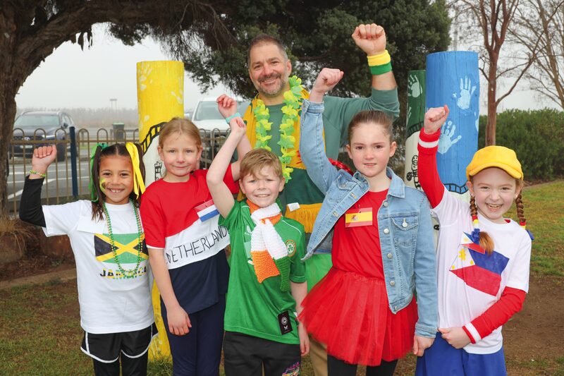 THE GAMES COME TO GRAHAMVALE... All teams represented. Pictured from left is student Zara who is team Jamaica, supporting the Netherlands is Astin, proudly wearing Ireland colours is Archer, Grahamvale Primary School principal Luke Simpson who decided to stay neutral and support Australia, competing for Spain is Ella and cheering on the Philippines is Audrey. Photo: Emma Harrop