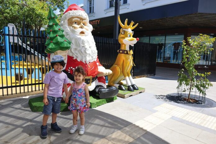 CHRISTMAS FUN IN THE MALL…Twinkling lights, Christmas Moooving Art Cows and giant baubles are starting to appear across the region as the count down to the festive season begins. Salaar and Aryana enjoyed seeing the giant Santa and Rudolph statues in the Maude Street Mall on Monday. Photo: Stephanie Holliday
