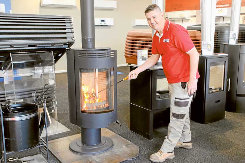 STOKING THE FIRES… Owner of Shepparton Heating and Cooling, Adrian Hamer stokes the fire on one of the Euro fireplaces on display. Photo: Steve Hutcheson