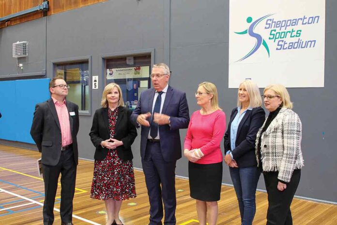 On court and ready for action, the bipartisan announcement was made at the Shepparton sports stadium on August 5, with Nationals leader, Peter Walsh captaining the pronouncement alongside shadow minister for sport, Cindy McLeish, Member for Northern Victoria Wendy Lovell, Liberal candidate Cheryl Hammer, National candidate Kim O’Keeffe and deputy mayor, Cr Anthony Brophy.