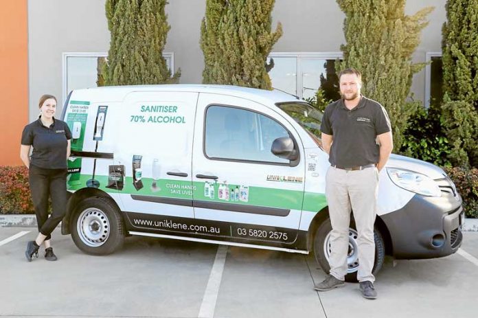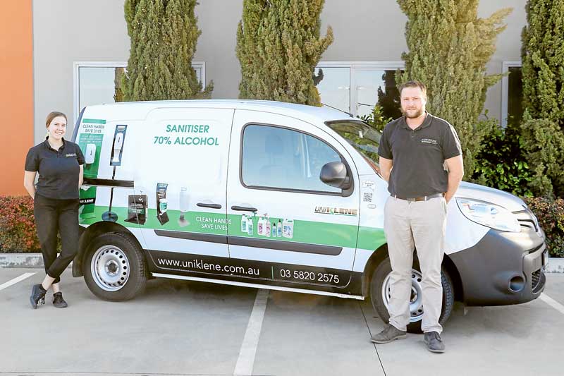 SQUEAKY CLEAN… From left, Uniklene receptionist, Courtney Voumard and sales, Daniel Ryan with their fully stocked van. Photo: Katelyn Morse.
