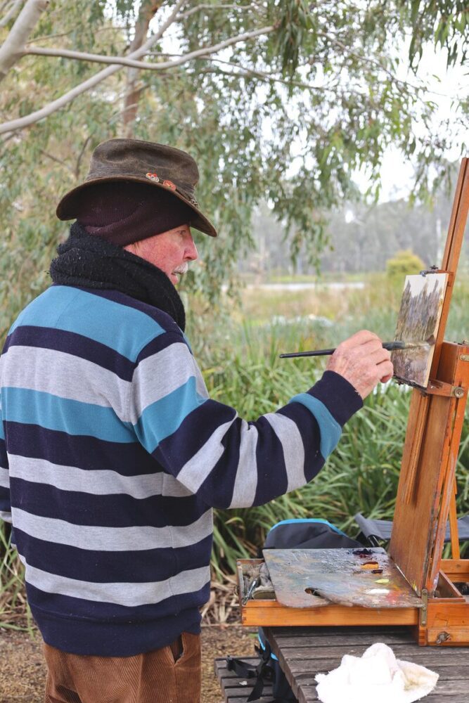 EN PLEIN AIR… GV Plein Air Artist Raymond Hill enjoys painting out in nature, rain or shine! Photo: Emma Harrop.