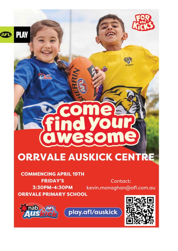 Your child doesn’t need to go to Orrvale Primary School to do Orrvale Auskick, you just need to select them when you sign up to join in the fun. The season is underway, but it’s not too late to sign up and join in the fun every Friday from 3.30pm to 4.30pm at 300, Channel Road, Orrvale.