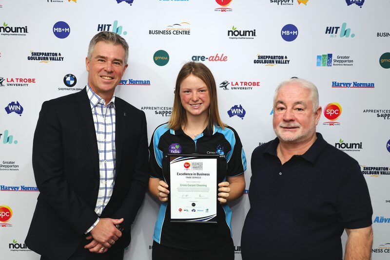 EXCELLENCE IN BUSINESS (TRADE SERVICES)... Cross Carpet Cleaning. Pictured: Richard O'Nians from the GMCU, Chloe Cross from Cross Carpet Cleaning and Peter York from SPC Global.