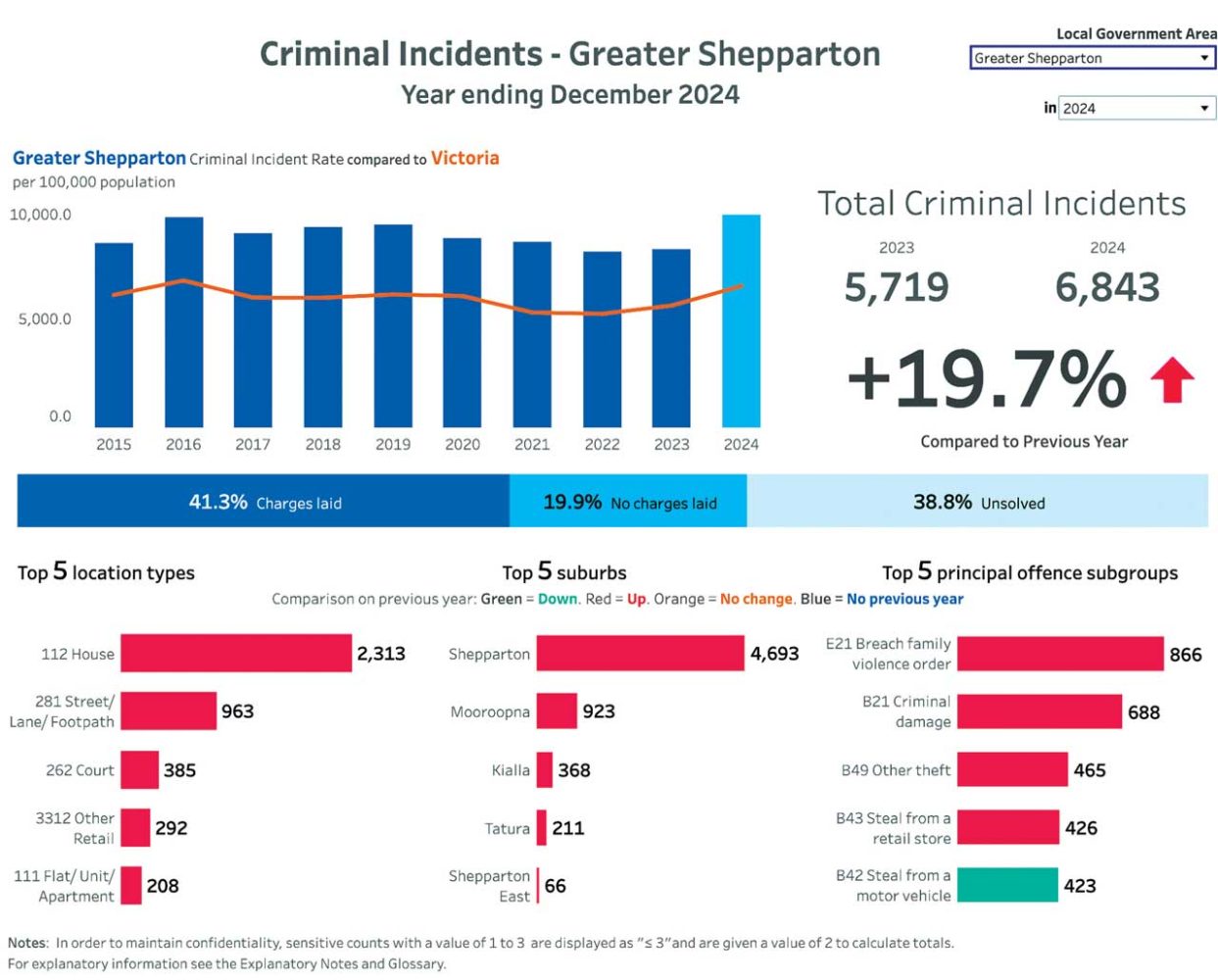 DATA released last week by Independent Crime Statistics Agency (CSA) confirms significant increases in offending across the year ending in December 2024, with the number of criminal incidents in Greater Shepparton rising by 19.7 per cent, higher than the statewide 18.7 per cent increase across Victoria.