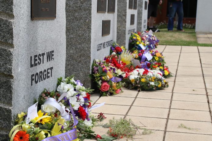 The national flags of Australia, New Zealand and the United Kingdom were raised from half-mast, and bugler, Bill Scott, was on hand to sound the Last Post prior to a minute’s silence, ending with a sounding of the Reveille.