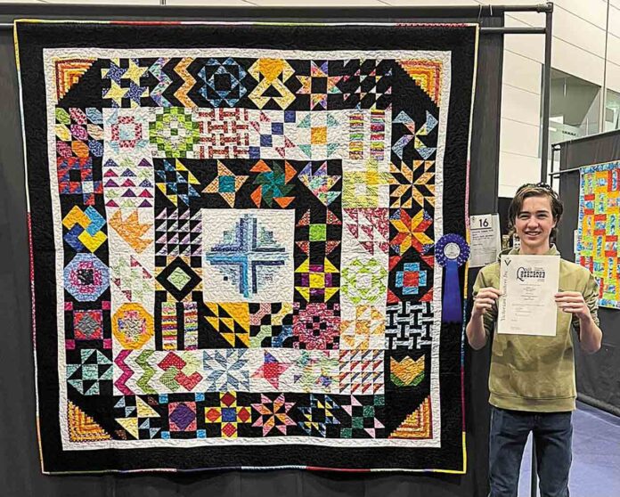 FIRST PLACE… Tatura local Connor Nevins, aged 15, was awarded first place in the Victorian Quilters Showcase 2022 for this colourful sampler quilt. Connor has made an incredible 12 quilts since he began sewing at age nine. Photo: Simone Sudholz