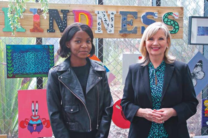 DISPLAYS OF KINDNESS AROUND SHEPPARTON… With a small grant from the State Government, young people have committed to making a display of kindness in the community, artist Rafiki and Greater Shepparton City Council Mayor, Cr Kim O’Keeffe stand before a display of artwork prepared by VCAT students at GOTAFE. Photo: Steve Hutcheson