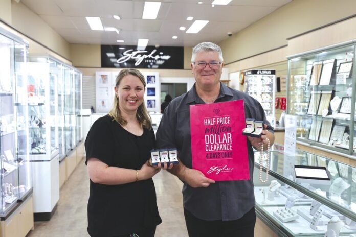 BIGGEST CLEARANCE SALE… Stephens Jewellers are having a half-price million-dollar clearance sale, for this week only at their Fryers Street store. From today until 3pm Saturday, hundreds of pieces in store will be discounted. Pictured is sales assistant Shona and Stephens Jewellers owner Stephen. Photo: Stephanie Holliday