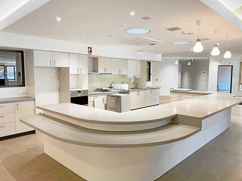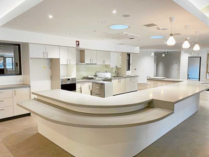 The single rooms all have their own ensuite, and each wing houses a large communal dining area, lounges, activity areas, guest visitor rooms for families of palliative residents, and a library nook. Outdoor courtyards and entertainment areas, as well as garden beds and barbecue areas are all part of a contemporary setting.