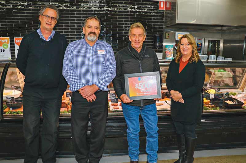 (From left) Foodworks Tatura assistant manager Steven Breen, store manager Craig Bramley, $500 GMCU Winner Ron Williams and Melanie Spencer advertising manager from The Adviser Photo: Stephanie Holliday