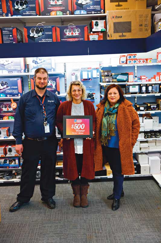 (From left) Manager of Jaycar, Chris Lane, $500 GMCU Winner Marita Davidson and Bronwen Timothee from The Adviser. Photo: Nicole Peters.