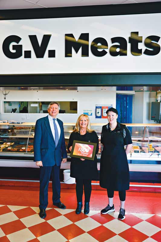 (From left) Shopping at GV Meats, managing director from The Adviser, Geoff Adams, with $500 GMCU Winner Paulette Adams and GV Meat’s cashier, Jacinta Lawless. Photo: Nicole Peters.