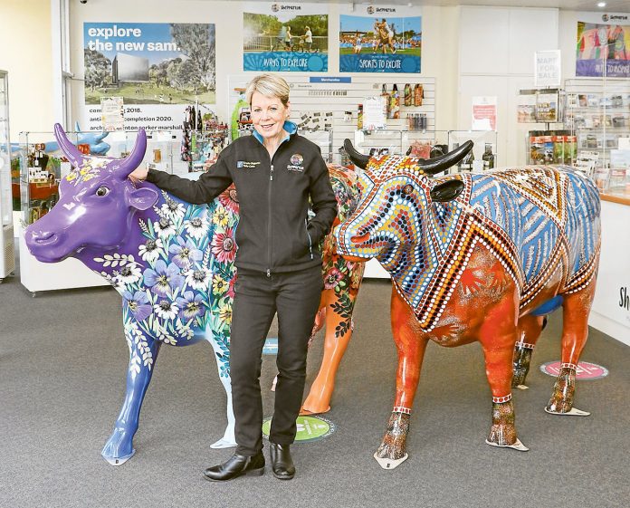 THE HERD… Greater Shepparton Visitor Centre visitor services officer, Wendy Mathews with the two new Moooving Art cows. Photo: Katelyn Morse