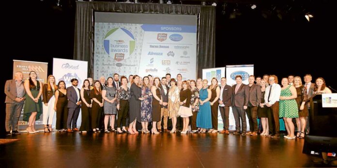 RECOGNISING LOCAL EXCELLENCE… The Shepparton Chamber of Commerce & Industry is excited to welcome the awards back to the GV Hotel on Friday, December 9. Pictured is the line-up of the 2019 White King – Pental 95.3 Triple M Business Awards’ winners and sponsors at the Gala Dinner in 2019. Photo: Alicia Niglia.