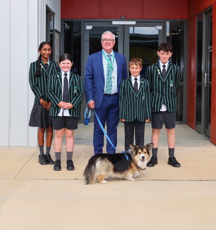 EXPANDING COMMUNITY AND CAMPUS… As 190 new students join All Saints Anglican School, the campus unveils its new Middle and Junior School buildings featuring flexible learning spaces, a dynamic Middle School hub and an all–inclusive, adventure–packed playground. Leading the school into Stage 3 of the Master Plan, which will extend the state–of–the–art STEAM precinct, are Junior School Captains Layla Kelly and Eli Thomas; and (back row) Middle School Captains Khaniskaa Kumaran and Alexander Bye, joined by Principal Jim Laussen and Harry the dog. Photo: Natasha Fujimoto