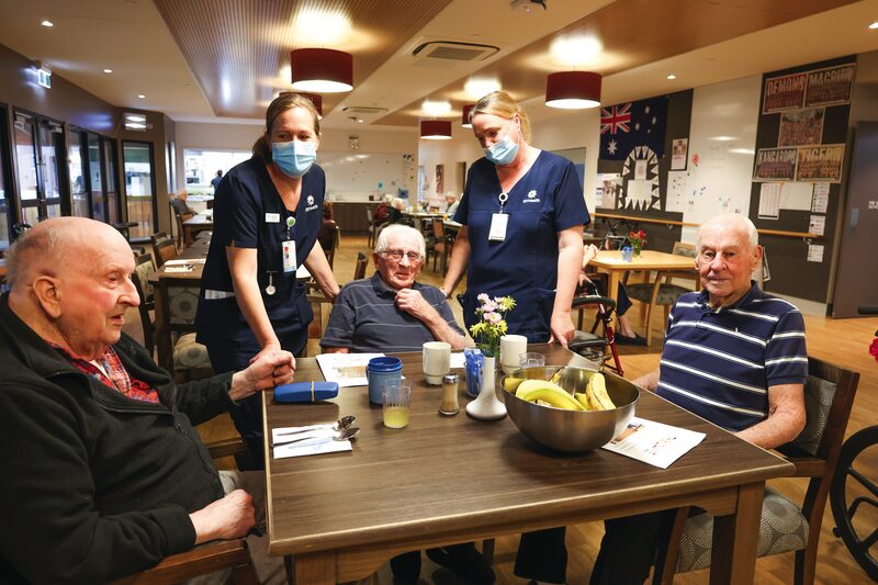 INTERESTED IN PURSUING A CAREER IN NURSING OR MIDWIFERY…now is the time to study, with a swag of initiatives and payments on offer from the state government. Back left: Waranga Health nurses Anne Hall- EN and Sandra Holden-EN helping residents (L), Barry Beechey, Bill Andrews and Jim Burrows get settled ready for their evening meal. Photo: Melanie Spencer