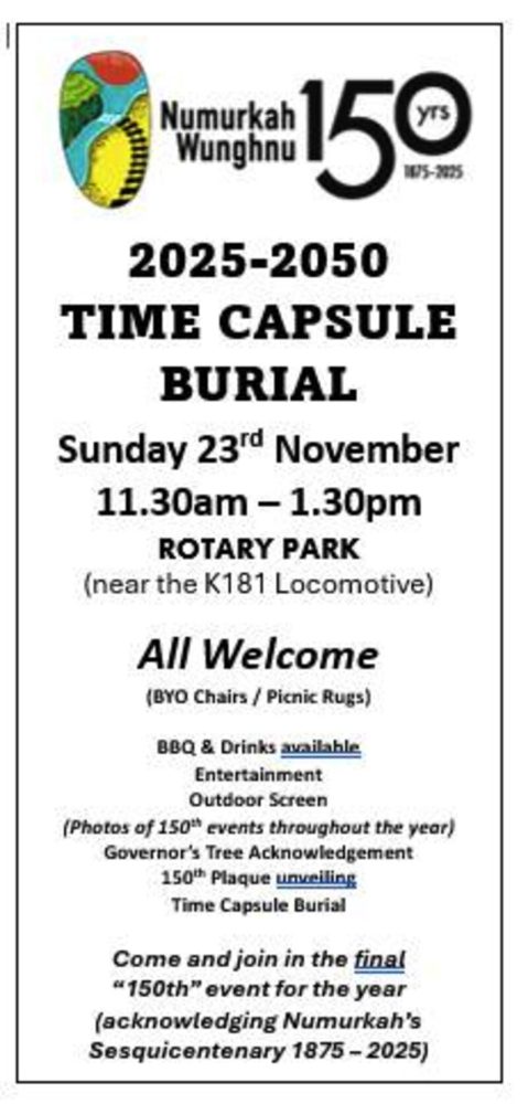 AS part of the Numurkah and Wunghnu 150th Anniversary Celebrations, they will be burying a Time Capsule on Sunday, November 23, at Rotary Park, Numurkah, from 11.30am to 1.30pm