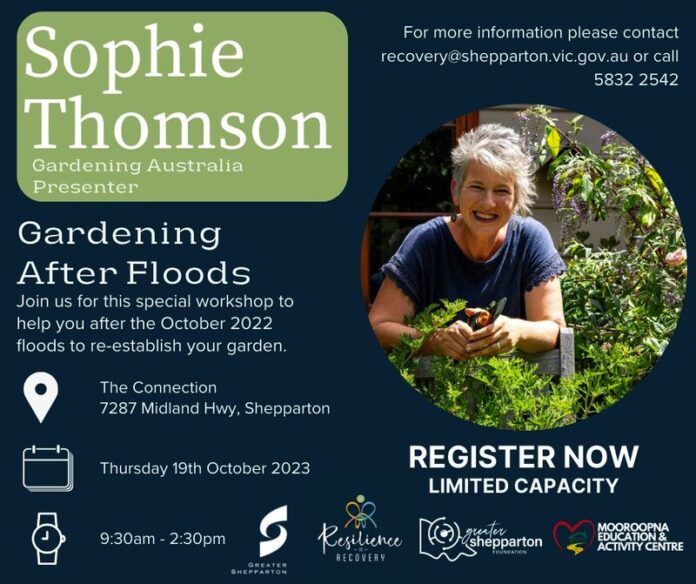 Gardening After the Floods workshop will be held at The Connection, 7287 Midland Hwy Shepparton, Thursday, October 19, between 9.30am and 2.30pm.