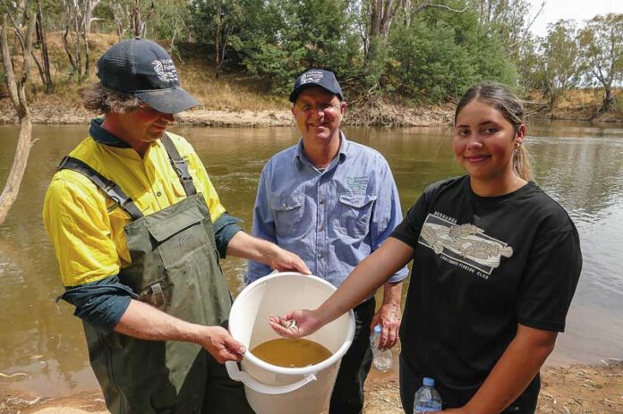SWIMMING FREE… Victorian Fisheries Authority (VFA) worker Jarryd McGowan, VFA native fish hatchery project director Anthony Forster, and GOTAFE student Wytasie Walker release golden perch fingerlings into the Goulburn River. Photo: Deanne Jeffers.