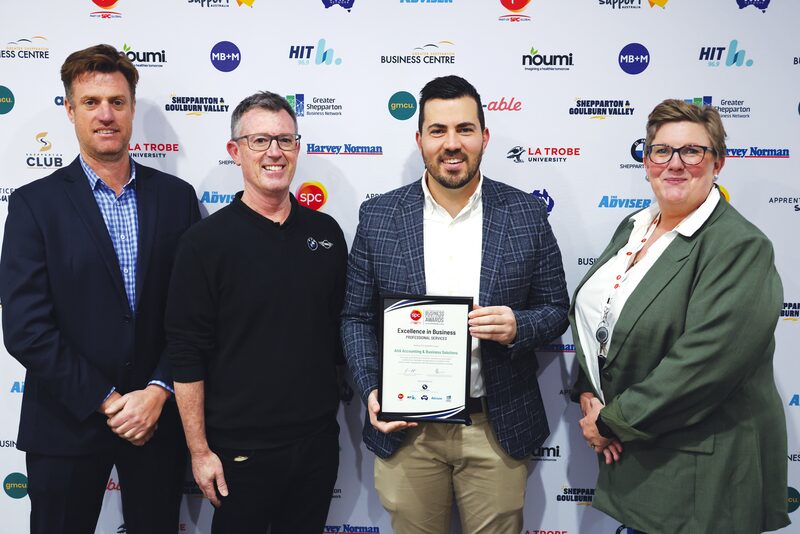 WEEK 3... Excellence in Business: Professional Services finalist, AHA Accounting & Business Solutions, sponsored by Shepparton BMW. Pictured: Mark Hunter from SPC Global, Glenn Goodall from Shepparton BMW, Salvatore Pennisi from AHA Accounting & Business Solutions and Shona Wallace from SPC Global.