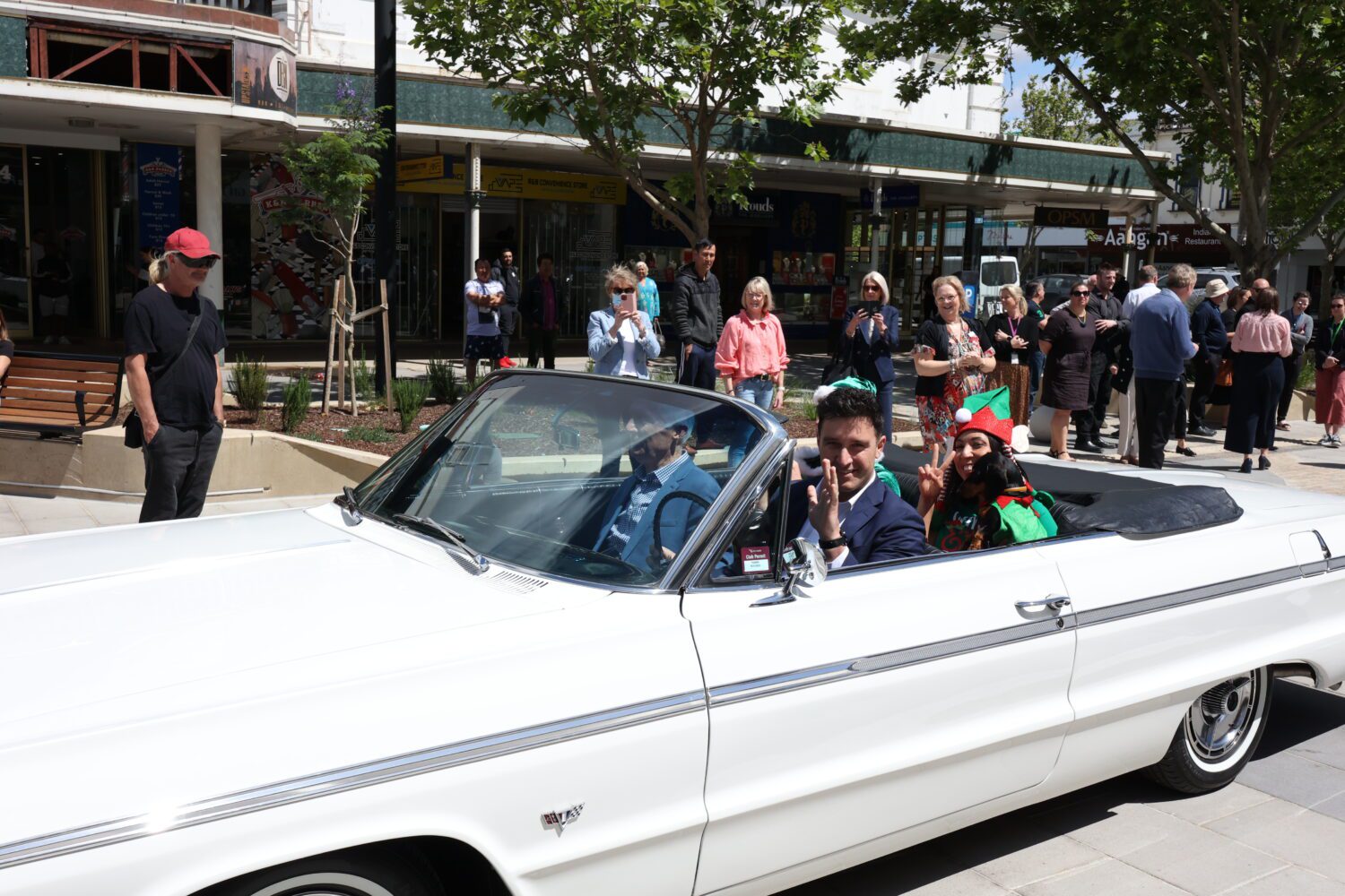 Cr Sali and Mr Anderson were the first to drive down the redeveloped Maude Street, riding in a classic Chevrolet with a trio of elves in the back seat.