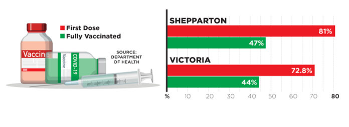 ACCORDING to Federal Department of Health data released on Monday, Shepparton has reached 81 percent with their first Covid vaccination, well ahead of the rest of the state at 72.8 percent.