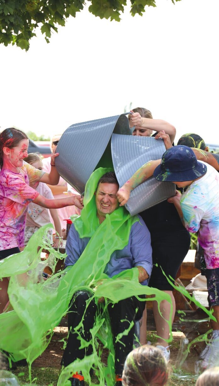 A challenge was set to reach $30,000 for the Principal Adam Brennan to be slimed, which the parents banded together to raise over $38,000 for the school. Despite some smooth talking from Mr B, he was coated in green slime to the delight of students and parents watching on.