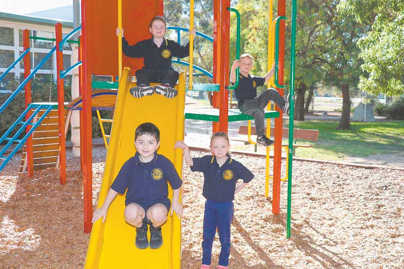 SUNS OUT… Congupna Primary School will receive funds to help with replacing existing shade sails thanks to the ‘School Shade Grants’ program. Pictured is Dusty Keeble (top of slide), Chad Thorn, Emily Bye and Nate Grutteria (bottom of slide). Photo: Stephanie Holliday