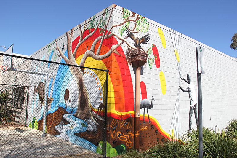 To that end, nine students have contributed to the imagery and design in creating a mural around the basketball court at the GOTAFE campus. Melbourne street artist George Manioudakis as artist-in-residence assisted with the design and helped the students master the medium and helped bring the vision to life.