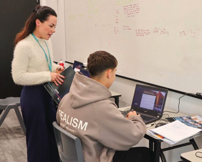 UP SKILLING… GSSC Year 10 students have been working in their Pathway Mentoring class, learning about vocational pathways, course requirements and subject choices for Year 11. Partnerships Manager, Lisa Kerr, assisting a Year 10 student with a Vocational Education and Training (VET) delivered to school students (VDSS) application form. Photo: Supplied