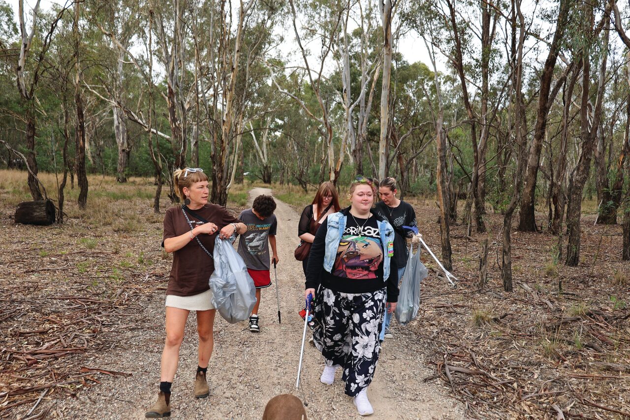 RECONNECTING WITH NATURE... Building on the research of Nature Scripts, headspace Shepparton has introduced Nature Neighbours, giving people aged 12 to 25 a chance to connect with themselves and others in a judgment-free space in different natural environments. From left, headspace's Loz, Lindsay, Zoe, Axel and Greater Shepparton Lighthouse Project's Tones, taking time to let go of modern-day stress, while picking up rubbish to have a positive impact on nature. Photo: Aaron Cordy