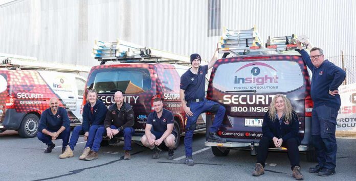 THE TEAM…Collaborative and close-nit camaraderie strengthen Insight Protection Solutions’ team of specialists. From right: Technician Chris, Office manager Vicki Liversidge, third year apprentice Rohan, technician Nathan, managing director Mark Liversidge, first year apprentice Melanie and senior technician, Peter.ON THE JOB…Security technician Nathan heads out to ensure another property is safe and secure. Photos: Kelly Carmody