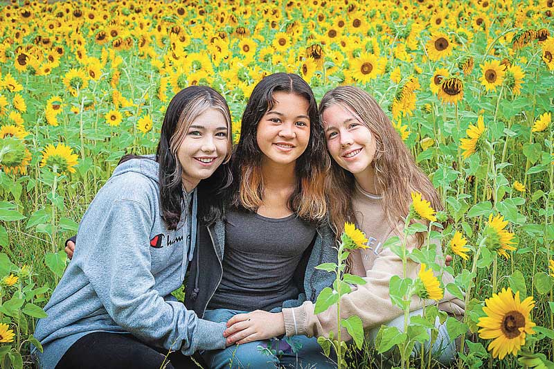 FLOWER POWER… Lucinda Watkins, Ruby Bilko, and Abigail Watkins enjoying the massive field of sunflowers that drew crowds out to Eden Farms in the last weekend of January. Photo: Katherina Baker.