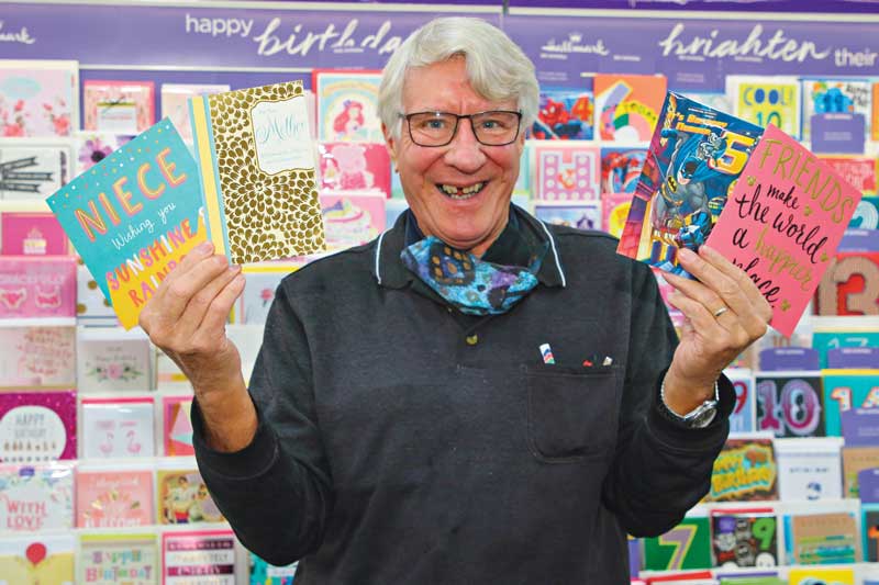 CARDS FOR ANY OCCASION… Focus Cards and Gifts owner, Peter Dunbabin, holds out some of the new titles in their card range. Photo: Steve Hutcheson